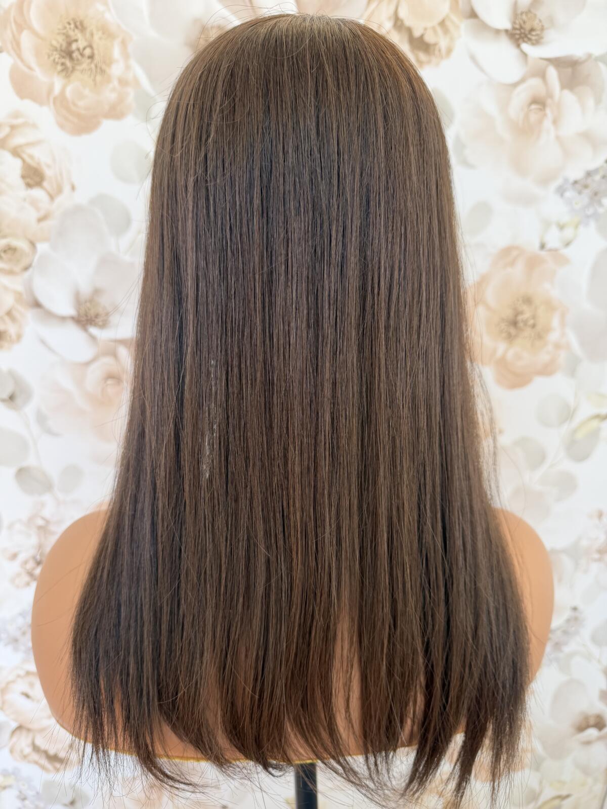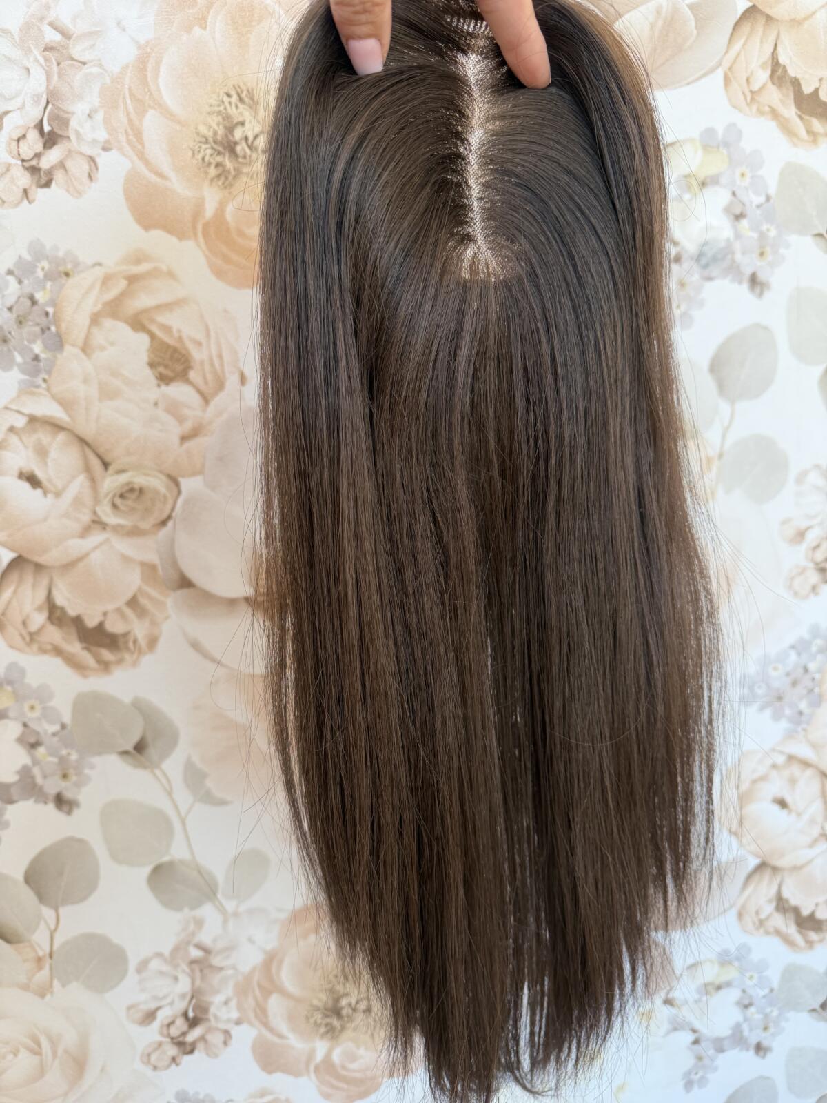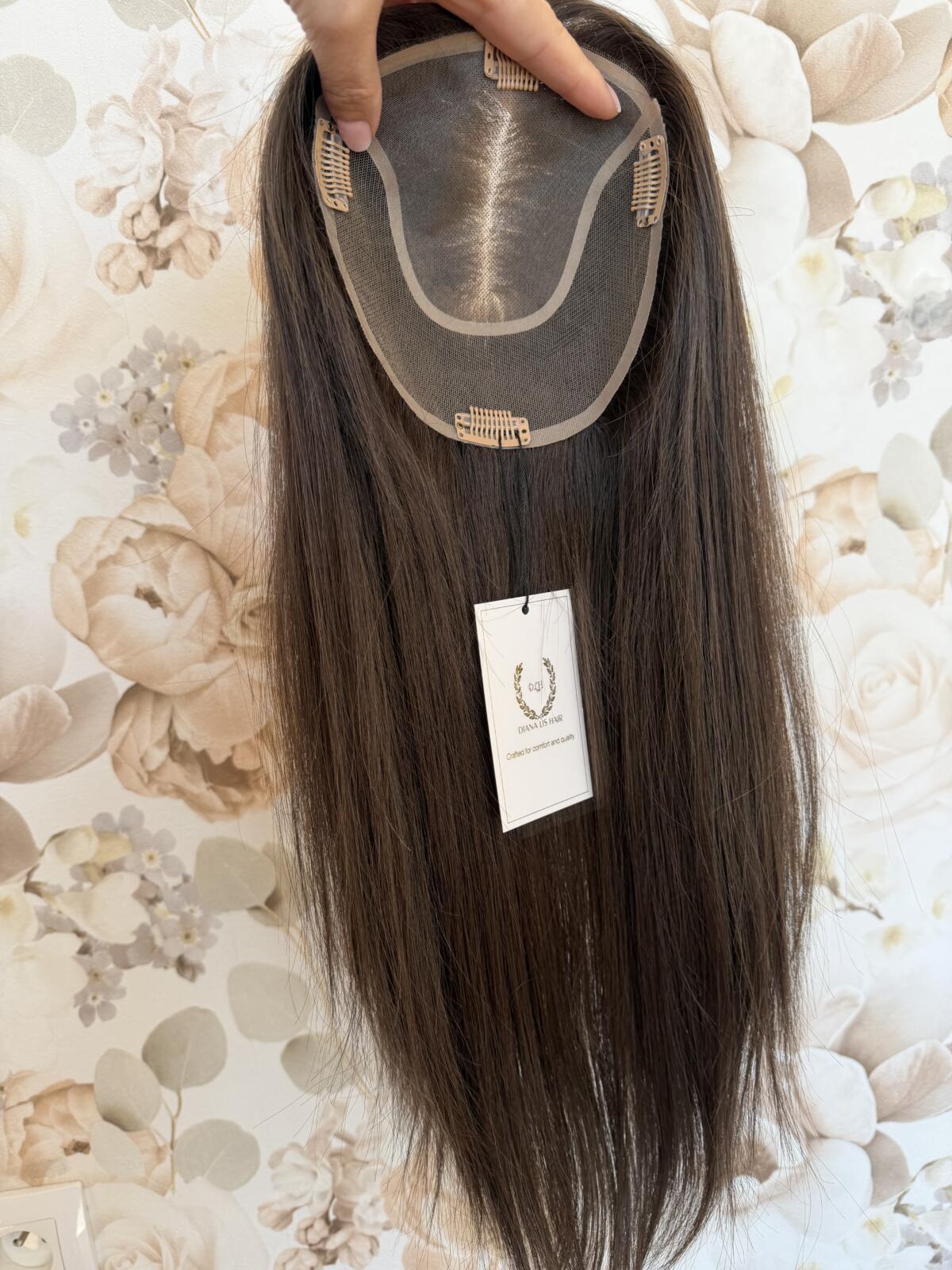 Topper w kolorze opalizującego zimnego brązu, wykonany jest na lekkiej konstrukcji mono, w całości szytej ręcznie. Możliwość przełożenia przedziałka pozwala na odtworzenie naszej fryzury. Topper o szerokości 16 cm x 16 cm daje dobre krycie. Topper leży płasko przy lini włosów, dzięki czepu wygląda niezwykle naturalnie. Mocowanie na cztery klipsy z możliwością ich usunięcia, lub zmiany miejsca.